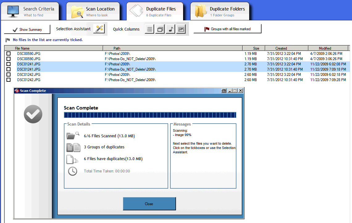 OK, here's the audit trail. This runs Duplicate Cleaner 3.0.6 to locate F:\Photos\2009\DSC00590.jpg and its duplicate F:\Photos-Do_NOT_Delete\2009\DSC00590.jpg.