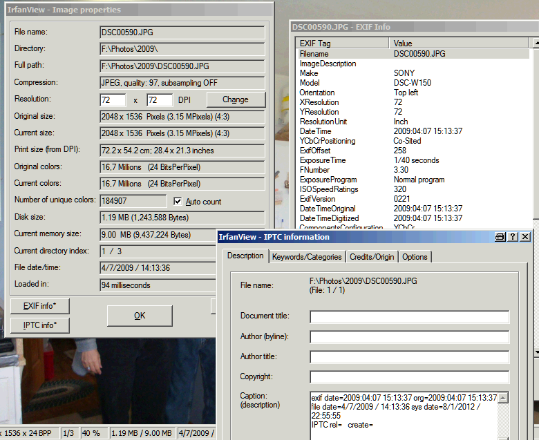 Now I use IfranView to add some text to the IPTC caption field, showing timestamps seen by IfranView. The template is: exif date=$E306 org=$E36867|file date=$T sys date=$U|IPTC rel= $I30 $I35 create=$I55 $I60.
