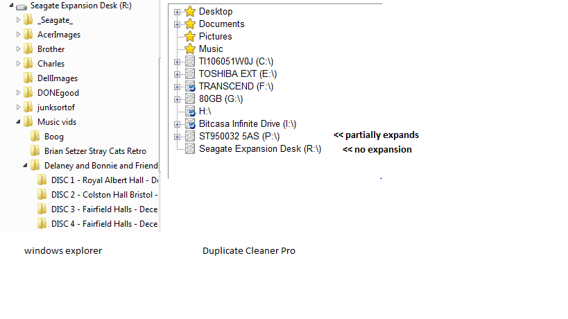 Duplicate Cleaner Pro shows both P: and R: (as well as all others) ... and all drives expand into their 'tree' except P: ... expands to SOME but not all, and to different tree 'levels' on those that do expand (hope that makes sense) ... and R: which will not expand at all. See attachment above.