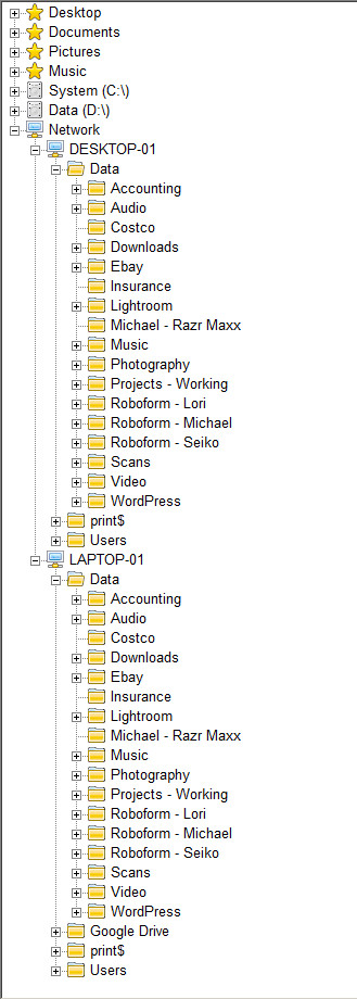 I just purchased the Pro version and immediately ran into a major problem. See the attached screenshot that shows the directory structure of our LAN. Duplicate Cleaner Pro shows the subfolders in the Data folder for both machines as exactly the same, when in fact, they are very different. The Desktop-01 machine is correct (that's where DCP is running). Laptop-01 appears as a duplicate structure, but that's completely wrong, Laptop-01 has many more subfolders with different names. Since DCP does not shows the actual content on Laptop-01, we can't search for dupes.