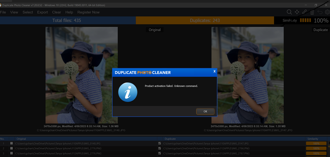 Your software (DC5.23.0.0) via payment confirmation does not install (C:\Program Files (x86)\Duplicate Cleaner 5\Fastenshtein.dll. 'verify access to that directory') and when I try to enter my lic key into the trial version I get a different error (see image)
