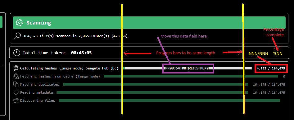There is no total percent complete because the program doesn't usually know how much is left - the amount left to do and calculate keeps changing based on the results of the previous stage. (Especially in Regular mode when using multiple criteria and quick-hashes).