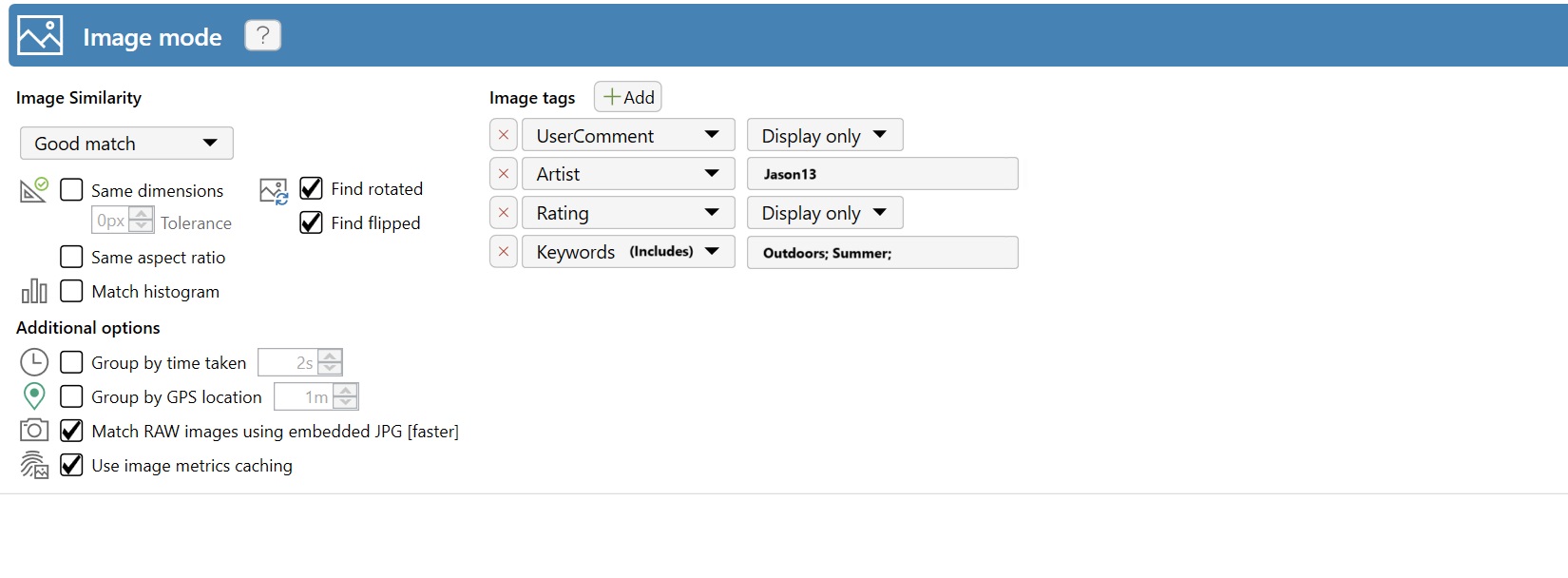 For example, assume I have a particular string in the Comments field of files, or I just want to scan any files that have *anything* in the Authors field. I'd like to be able to, in the Scan Location tab, set up Keywords: 'SpecificKeyword' or Authors: 'SpecificKeyword' or even just 'Yes', and on running the scan have the software check the folders, ignore any files without those specific keywords or Author name or a blank Author field, and then continue the scan from that point, instead of scanning duplicates against all items in the folders.